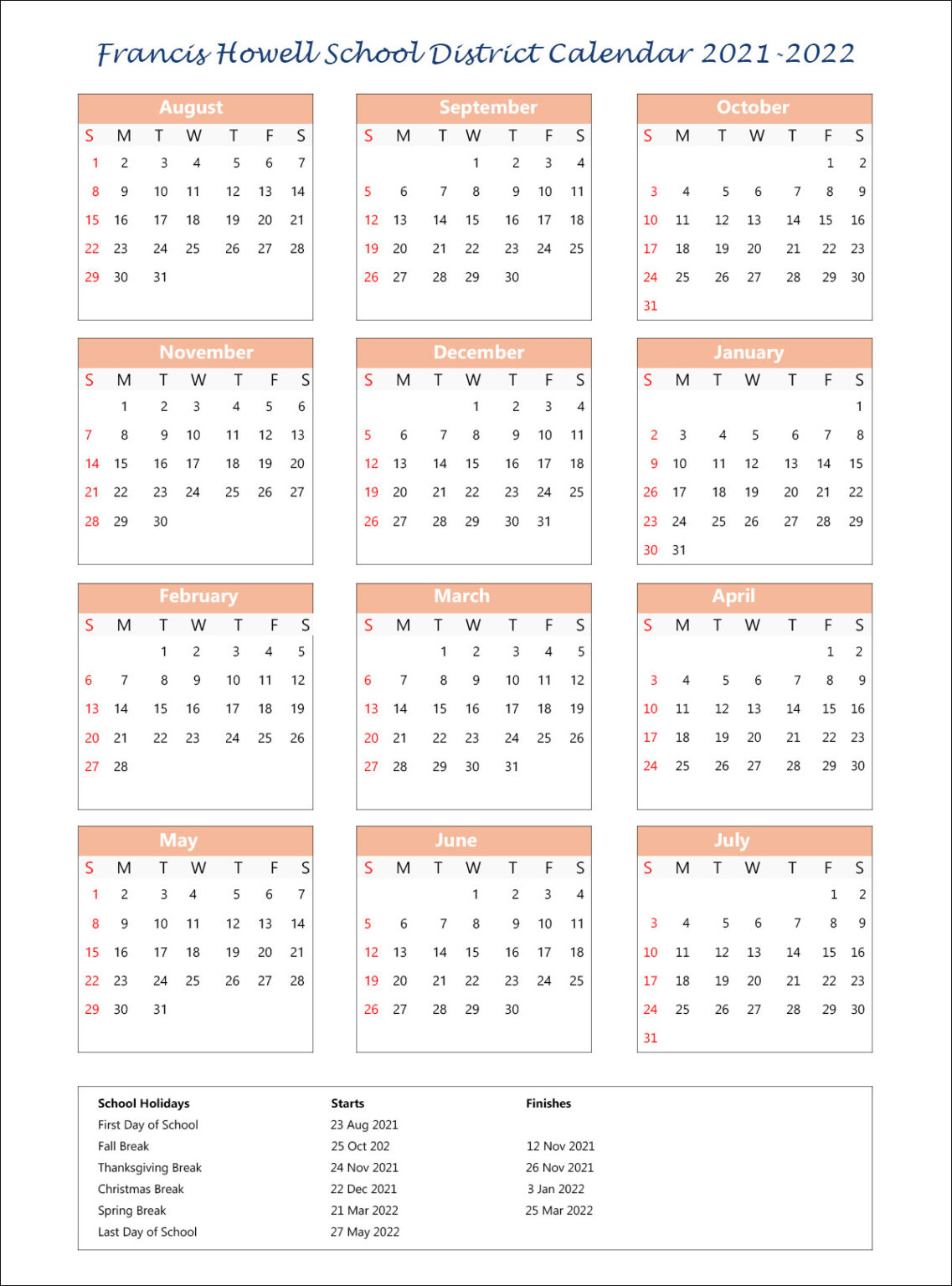 Howell Township Public Schools, Encompassing more than 150 square miles. Listed below are the approved school calendars for the current and upcoming school years.